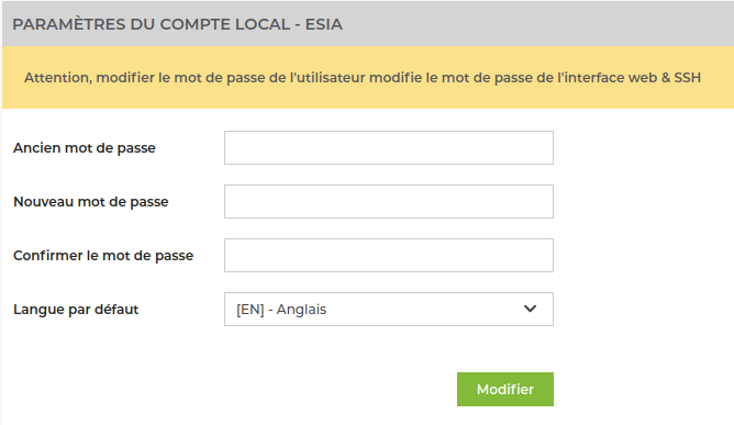 Cliquez sur “modifier” pour appliquer les changements. Le mot de passe de l'utilisateur “Esia” est maintenant modifié. La manipulation change aussi le mot de passe de la connexion SSH (port 2222).