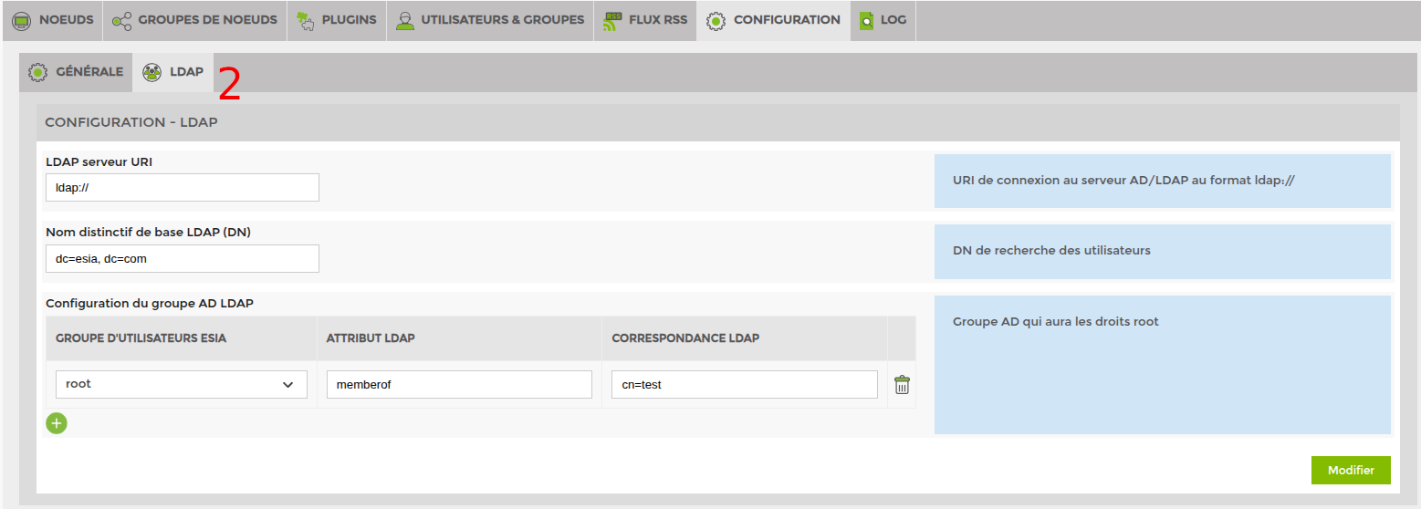 Pour pouvoir utiliser LDAP, il vous faut d'abord connecter votre serveur Esia à votre annuaire. Rendez-vous dans la partie “configuration” et ensuite cliquez sur l'onglet “LDAP”.